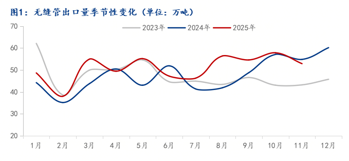 2025年1-11月中国累计出口无缝管561.02万吨,同比增长9.55%,11月中国出口无缝管52.85万吨,环比下降8.58%,同比下降3.54%。