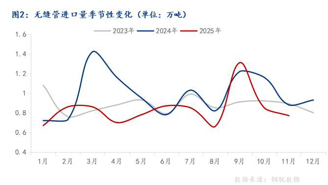 1-11月中国累计进口无缝管9.18万吨,同比下降12.50%;2025年11月中国进口无缝管0.77万吨,环比下降9.18%,同比下降15.55%。