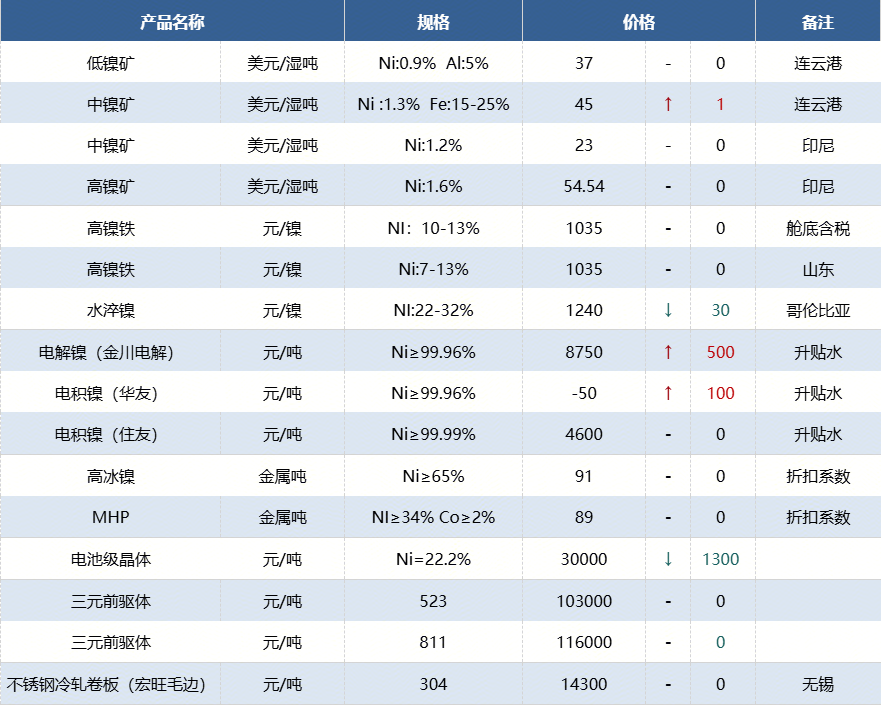 精炼镍上海市场主流参考合约:沪镍2602合约。主流升贴水:金川电解+8500~+9000元/吨,俄罗斯镍+300~+600元/吨,镍豆+2300~+2400元/吨,博峰镍-200~-100元/吨,住友镍+4500~+4700,挪威镍5100~5300元/吨。